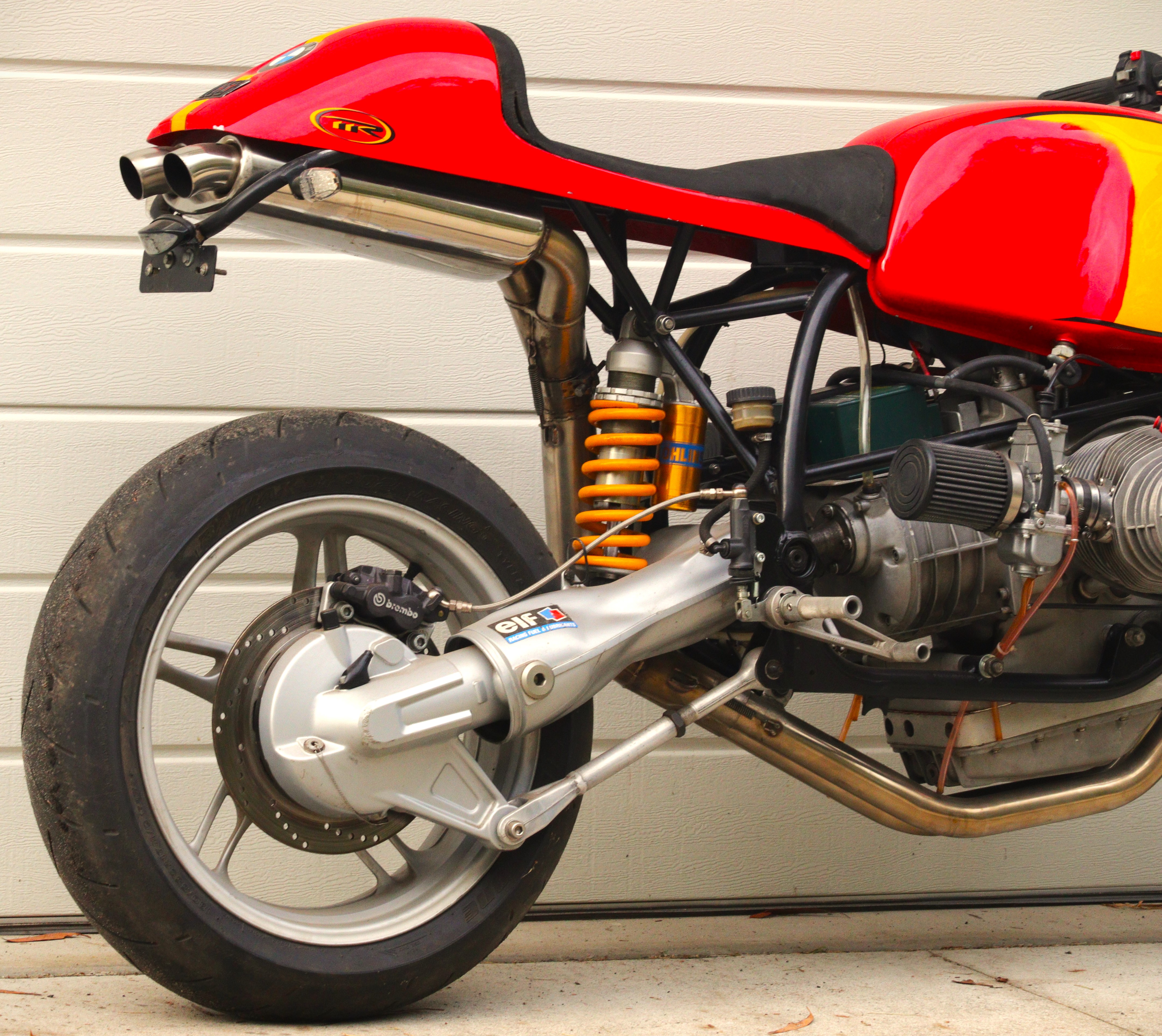 While parts were gathered for the engine work began on the chassis. A sound frame was sourced and treated to the Paul Rooney experience. The engine mounts were relocated and reinforcing was performed. The drive line would now point that power right at the centre of that rear wheel hub, no kinks in delivery. Delivering that power to the ground an r1150r final drive and swing arm was mounted with the rear suspenion mounts of the frame adapted to suit. It’s both an elegant and effective solution. The front forks retain the BMW heritage of the late 80’s and 90’s Battle of the Twins. The use of K series forks and brakes on R series engines became popular in racing and also on the street. Max had first hand experience of this; “the front forks are out of a K1000RS because the Brembo brakes on the K100RS I owned back then were the best I’d felt“