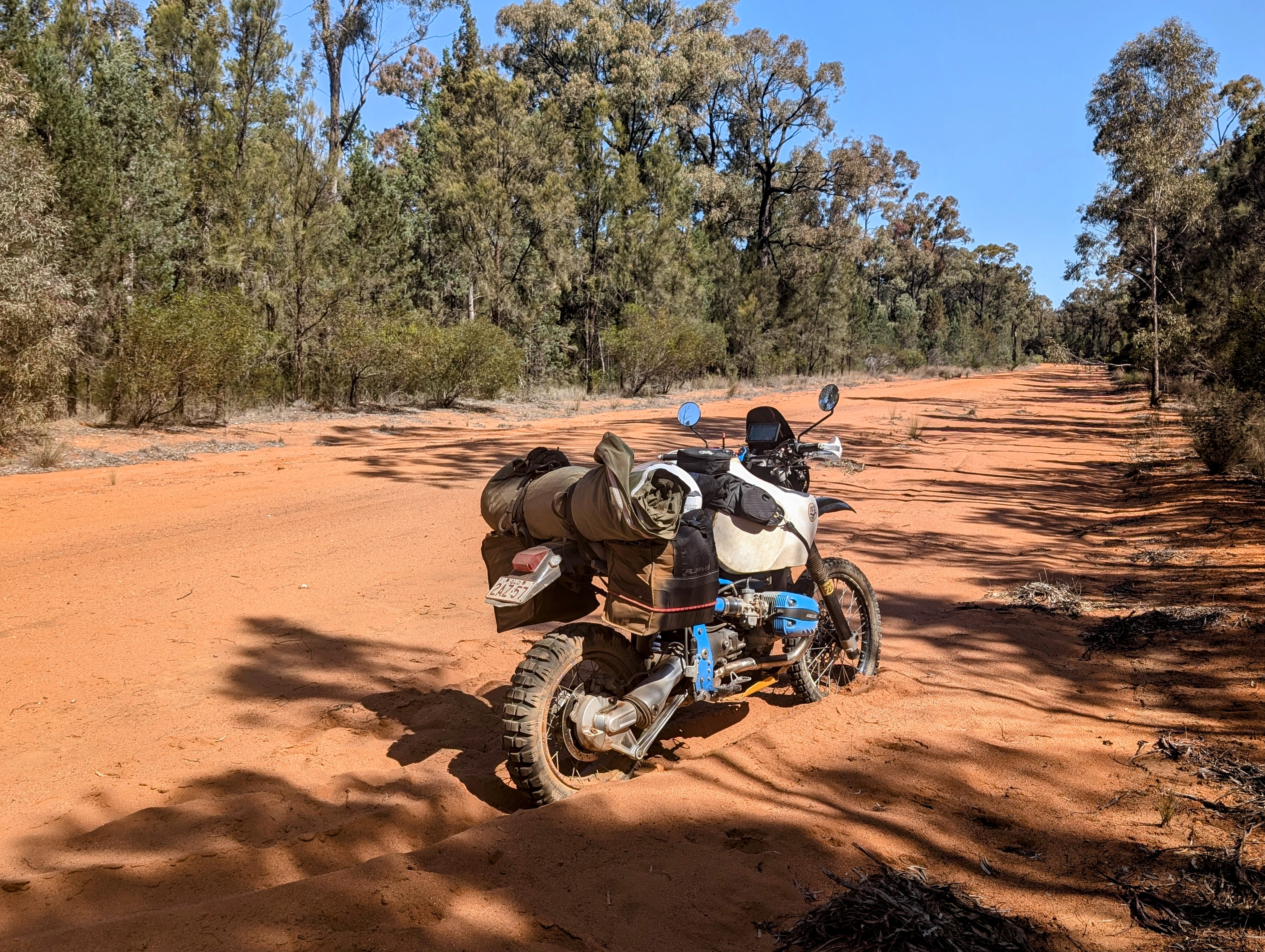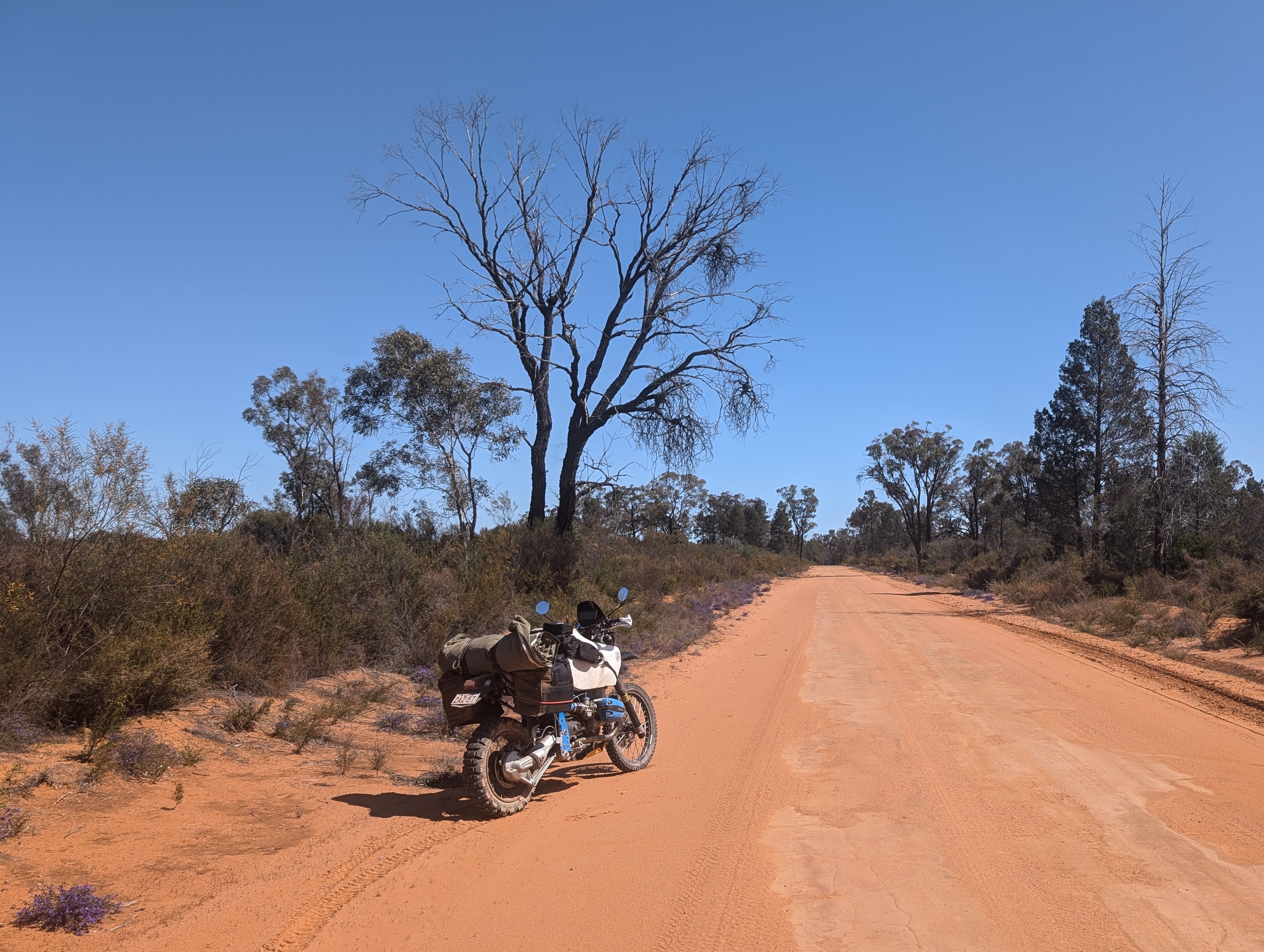 There are many more pictures of course but below is my favorite bike shot. The story written in the wheel ruts….On occasion I came up behind people with giant 4×4 towing giant caravans all throwing up massive clouds of lingering dust. They will never see you (some I’m sure never look to) and so the best option to come around was to get over on the shoulder, flash the light, sound the horn and shoot past. But you have to get that right, or, it might all go wrong.